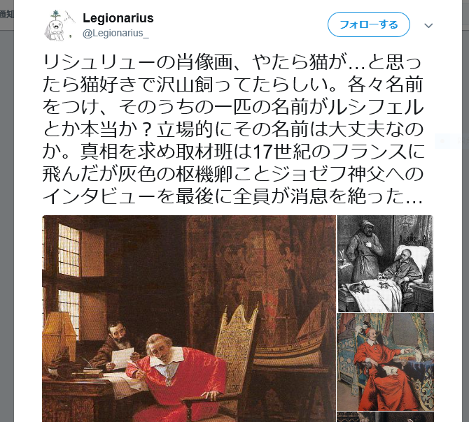 つい先日ツイッターにこんな面白い話が流れてきまして。リシュリュー閣下と猫の話なんですけど。